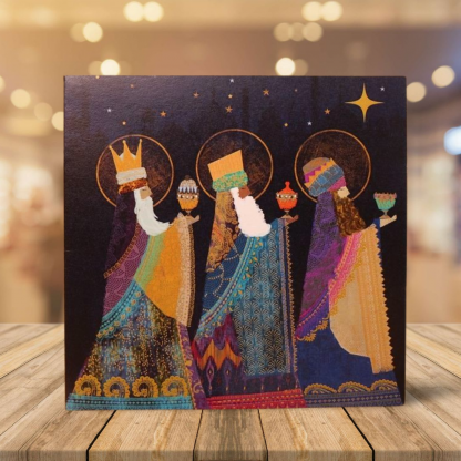 Honour the Christmas story with this stunning depiction of the three kings. Set against a midnight blue sky scattered with stars and guided by the shining star of Bethlehem, the three kings stand in regal splendour, bearing their precious gifts. Richly detailed with vibrant robes featuring intricate patterns and luxurious gold accents, this card captures the majesty and reverence of their sacred journey. The artistic style combines traditional imagery with contemporary illustration, creating a card that feels both timeless and fresh. Pack of 10 cards with envelopes. Every purchase supports The Door Youth Project.
